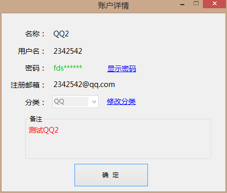 双击右侧的账户条目即可,如图,点击”显示密码“后会显示全部密码位数,否则默认显示前三位,修改账户分类,修改分类也在此处。
